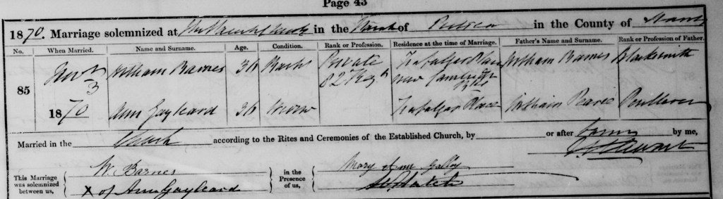 In 1870 Ann remarries to William Barnes a private in the 82nd regiment, he from Lancaster. In the marriage certificate we find that Ann’s father is William Pearce, listed as a poulterer. Currently I have found no information on William Pearce. At the wedding as a witness is Mary Ann Galley, Ann’s daughter.