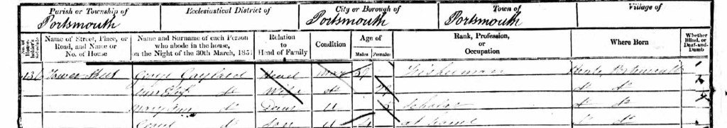 Even though it is hard to read this the 1851 census with George, Ann, Mary Ann and George listed as living on Tower Street in Portsmouth. This is the only time Ann is listed as Ann Elizabeth. In all the future census records you see them as listed as being born in Portsmouth, Hampshire.
