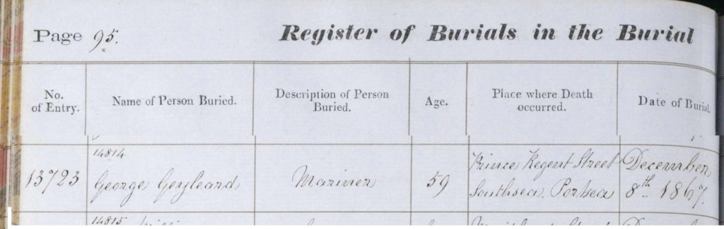 This is George Gayleard’s burial record, he is buried on December 8th, 1867. His place of residence and death is Prince Regent Street, Southsea, Portsea.