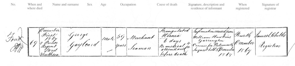 George Gayleard dies December 1st , it lists him as being 59 years of age of a “strangulated hernia, 6 days no medical attendance before death”
