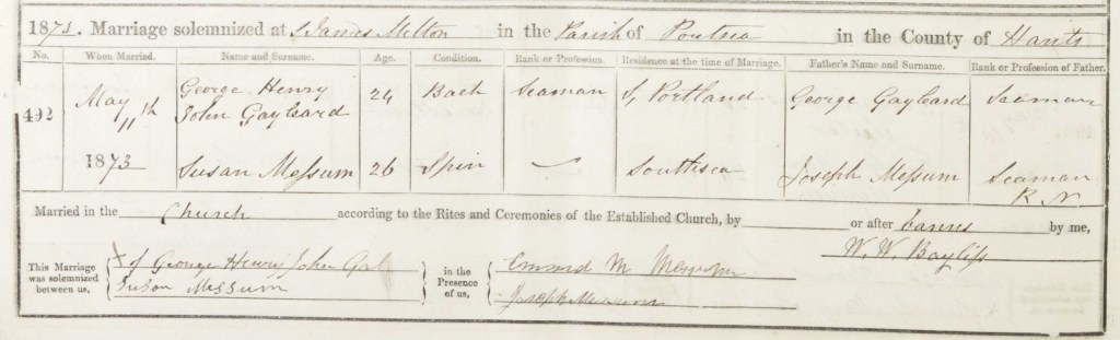 In 1873 George marries Susan Messum daughter of Joseph Messum. In here you can see that George is also a mariner much like his father George.