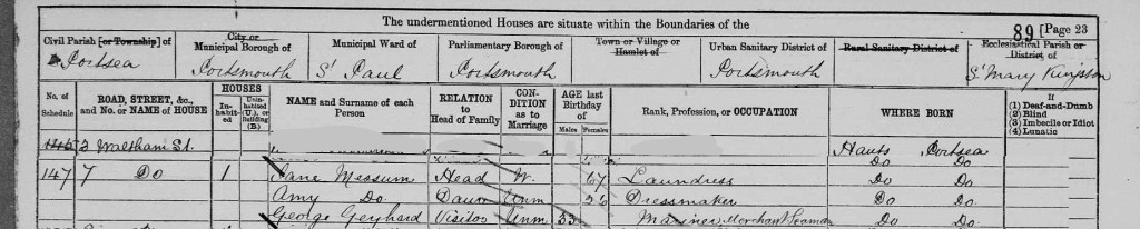 In 1881 George Gayleard can be found in Portsea, however the spelling of the name is Greyhard so was a little hard to find at the beginning. What also is interesting is that George is listed as a visitor in Jane Messum’s house and not as her son in law and that he is unmarried. Jane and Joseph Messum had two daughters, one Susan and the other Emma, both get married in the 1870’s. However in the census record there is an Amy Messum listed as her daughter. After a bit of investigation I found that Amy Messum also appears in a newspaper report as Amy Gayleard. So at some point Susan changes her name to Amy and then moves back in with her mother, Jane.