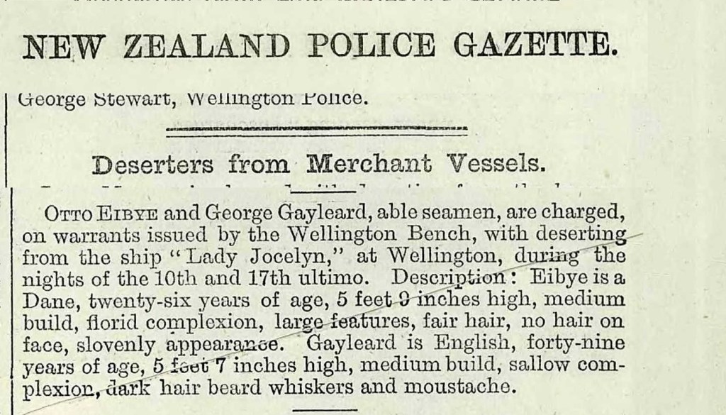 So in 1884 George Gayleard jumps ship in New Zealand and there is a warrant for his arrest. What is nice about this is that there is an actual description of George and names the ship he deserts from. But why did he jump ship?
