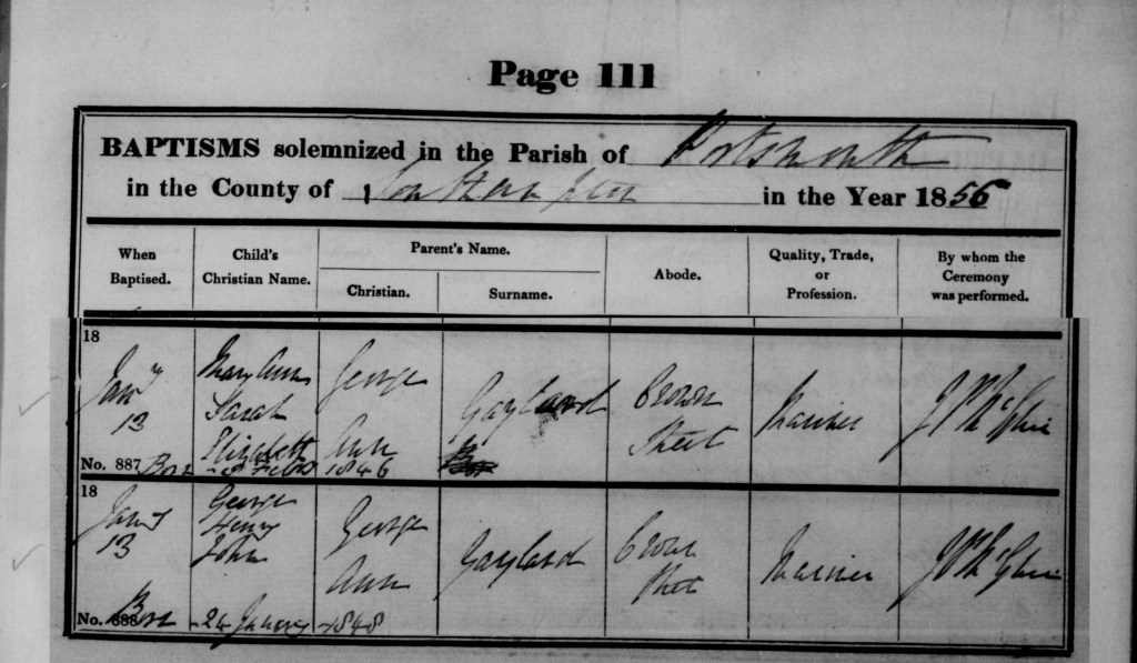 In 1856 Mary Ann and George are baptized again, you can see that Mary Ann is listed as being born in February of 1846 and George is listed as being born in 1848. The family is listed as living on Crown st and of course the name is spelled Gaylard or Gayland.