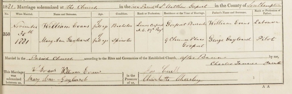 On November 30th, 1881 Mary Ann Gayleard marries a second time to William Evans a lance corporal in the 59th Regiment, originally from Mountain Ash, Wales