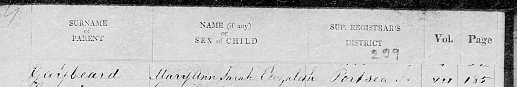 The birth of George and Ann’s first child, Mary Ann Sarah Elizabeth in 1846. She married at least twice and lived until the late 1920’s. She is was often referred to as Aunt Polly.