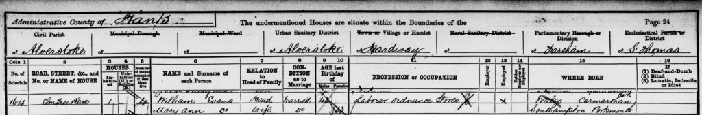 In 1891 Mary Ann and William have moved to Alverstoke and William is listed as working as a Labourer ordance stores.