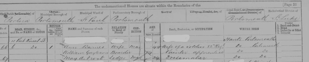 In the following census in 1871 Ann and William are still living in Portsmouth. William Barnes is not present at the time, however Ann is listed as wife of soldier in the 82nd Regiment. William Gayleard is listed as a boarder and at the age of 14 is now a painter apprentice. With them is Mary A. Frost, a dressmaker.