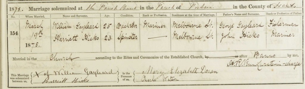 In 1878 William Gayleard married Harriett Hicks, daughter of John Hicks, mariner and Jane Hicks. Although it lists William as being 25 he is only 21 years of age. And Harriet Hicks was born in 1845 making her 33 years of age. However it seems that throughout the course of their marriage and travels together Harriett would most times be recorded as 1 or 2 years younger than William. It was the same with William’s mom Ann and his sister Mary Ann, all 3 women recording their ages as much younger, and sometimes by as much as 10 years.