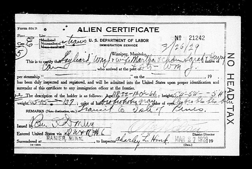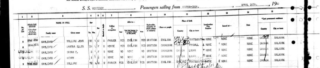 In 1929 William John Gayleard and his family, wife Nellie, daughter Sarah, son Henry and his father William Henry crossed over the US border of Ranier, Minnesota on the way to Cuba and the Isle of Pines. The Isle of Pines has been renamed to the Isle of Juventud since then. They do include a bit of information, like their ages, 48, 22, 1 1/2, under 1 and William Henry being 66. Also their hair colour and eye colours.