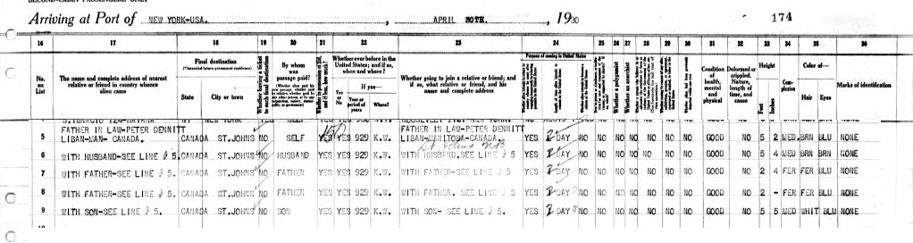 Here is them landing in New York on April 26th, 1930 on the ship the Monterey. Again they give detailed descriptions of all of them and what is interesting is under the Country of Nationality they are all listed as British even though Nellie, Sarah and Henry are born in Canada.