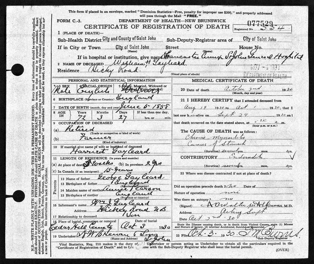 William Henry Gayleard passed away October 2nd, 1930 in St John, New Brunswick, he was 73 years old.