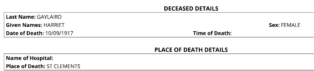 Harriet Gayleard, nee Hicks died on September 10th, 1917 and is buried at St James Anglican Cemetery in Poplar Park.