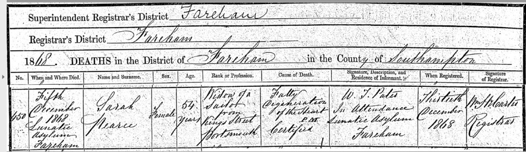 Sarah Pearce shows up in the 1861 census as a patient in Fareham Hospital. So I sent away for some more information to guess if it was indeed Sarah Gayleard or not.